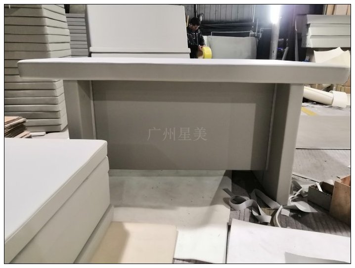 ?工字腿談話桌?(1600*900*760)與?三邊防撞桌?(1600700760)采用弧形包邊設計,阻燃皮革覆蓋膠合板框架,降低碰撞損傷?5。