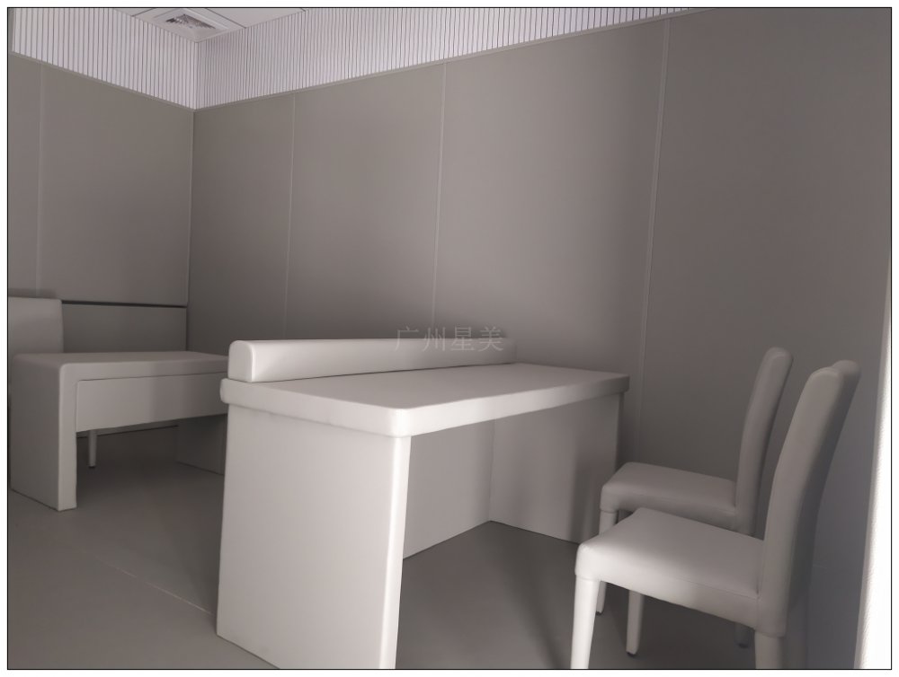 在留置室、談話室及審訊室等特殊功能場景中,安全防護與環保性能是空間設計的核心需求。廣州鴻星新材料建材廠家基于多年經驗,推出以聚乙烯棉為核心的防撞軟包系統,結合硅橡膠輔材及定制化家具,打造全方位安全防護方案。