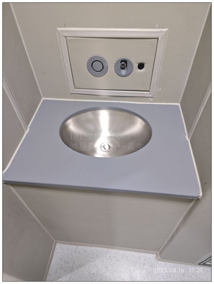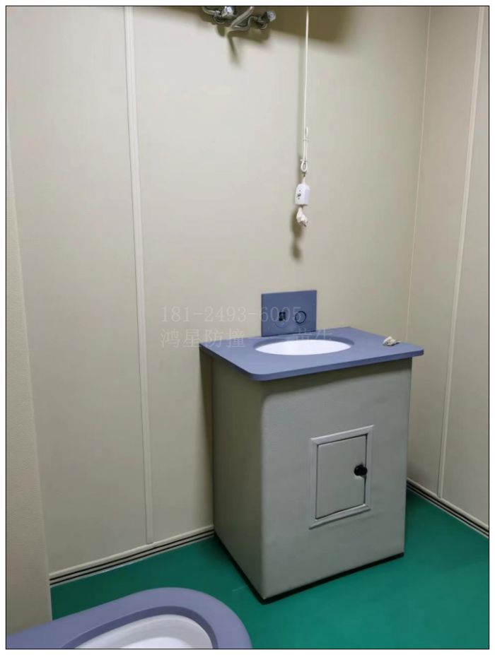 紀委監委談話室留置室衛浴間里的安全軟包馬桶及洗手盆是鴻星建設采用鑄模定制生產配套的硅膠套,將其包裹于法恩莎定制款的馬桶,從而達到防撞防水的效果。